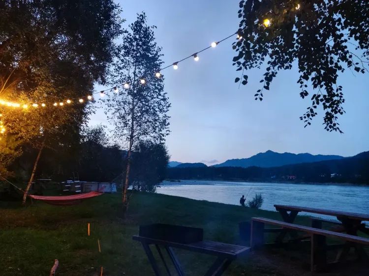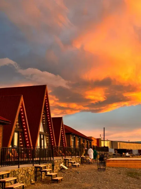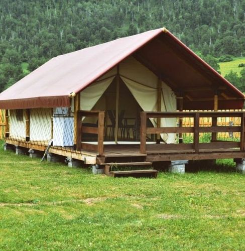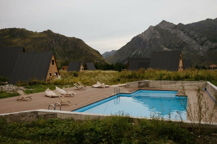 Проживание: в современных палаточных шатрах и комфортабельных модульных домиках. Каждый домик оснащён всем необходимым для отдыха: удобные кровати, обогрев, розетки, а также горячая вода и кондиционер. Для максимального расслабления на территории есть баня с чаном, бассейн с подогревом, мангальная зона и костровые площадки. Гости могут отдохнуть на качелях с панорамным видом на горы и реку, воспользоваться бесплатным Wi-Fi и открытой парковкой.
