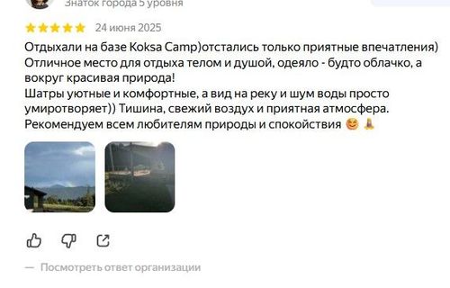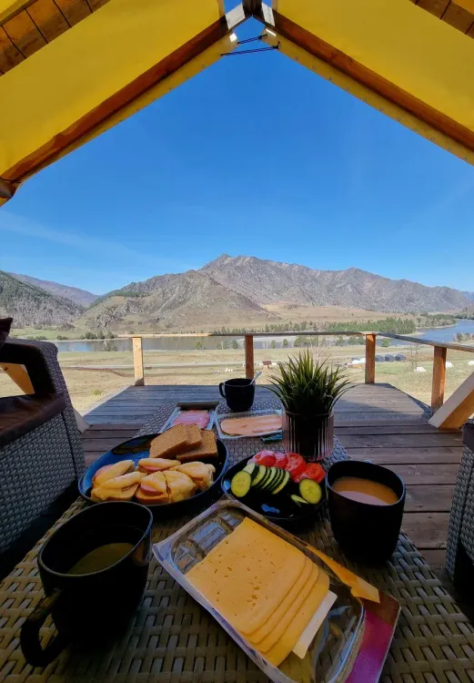 Проживание: глэмпинг расположен в живописном Шебалинском районе Республики Алтай, всего в 3 км от села Черга. Уединённое расположение и ограниченное количество мест гарантируют атмосферу тишины, уюта и полного единения с природой. Территория комплекса окружена величественными горами, лесами и чистой рекой. Вы можете остановиться в собственной палатке или выбрать один из уютных шатров, полностью подготовленных для комфортного отдыха. В каждом шатре есть оборудованная кухня, спальная и обеденная зоны, а также закрытая терраса со всем необходимым. Это место создано для тех, кто ценит природу, романтику и аутентичный отдых. Если вы ищете сервис уровня пятизвёздочного отеля, рекомендуем рассмотреть другие варианты
