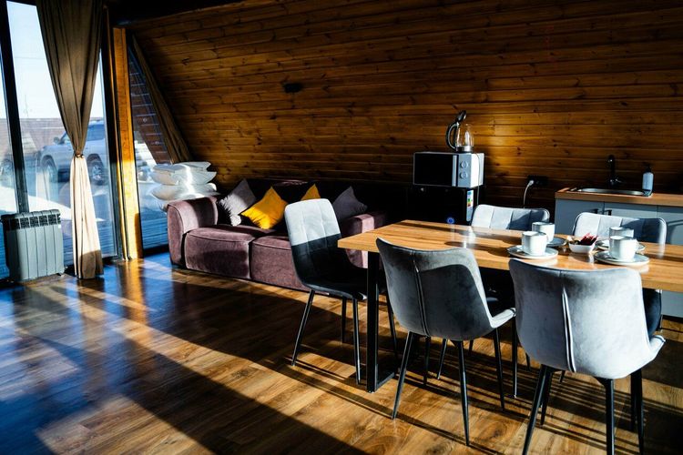 Проживание: для гостей созданы просторные и уютные домики, где всё продумано для вашего комфорта. В каждом из них: спальня с двуспальной кроватью;гостиная с мягким диваном, обеденная зона со столом, современная ванная комната с душевой, терраса с панорамным видом на Алтайские горы. Для уюта даже в холодное время года в домиках установлена система «тёплый пол». А чтобы утро было по-настоящему приятным, вы можете заказать завтрак прямо в номер.