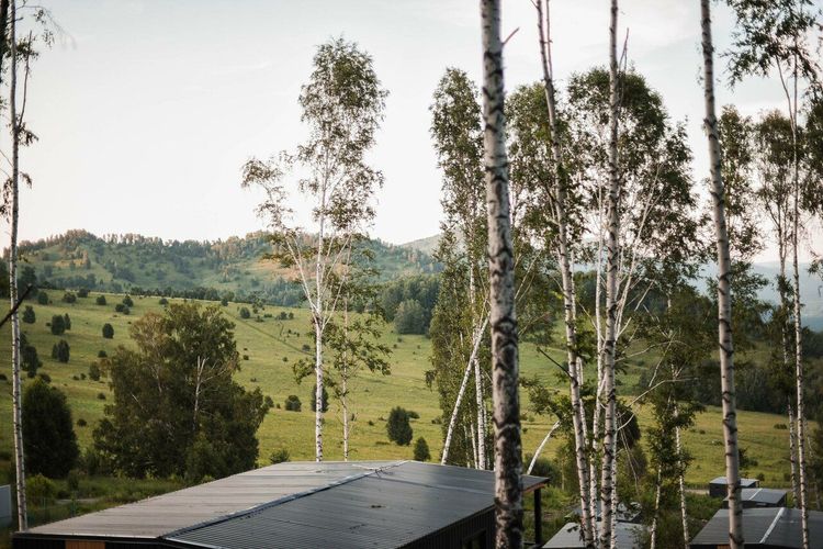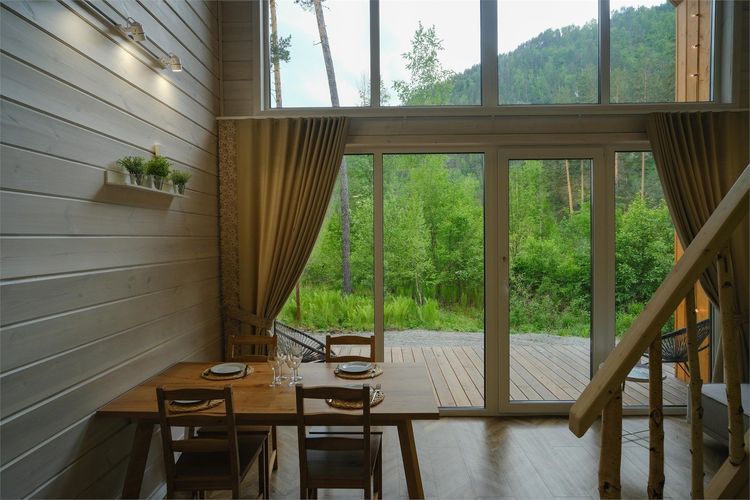 Проживание: эко-отель находится в живописном уголке, окружённом красивыми горами и сосновым лесом. Здесь можно в насладиться красотой алтайской природы и проводить время на свежем воздухе прямо на берегу Катуни. Для гостей предусмотрено 10 стильных барнхаусов, каждый из которых гармонично вписан в окружающий ландшафт и открывает великолепный вид на горы и бурную реку. Внутреннее пространство продумано до мелочей: на первом этаже расположена просторная гостиная с уютным диваном, телевизором и огромным панорамным окном высотой в два этажа. На втором этаже находится спальня с панорамным видом, где можно отдохнуть и зарядиться энергией природы