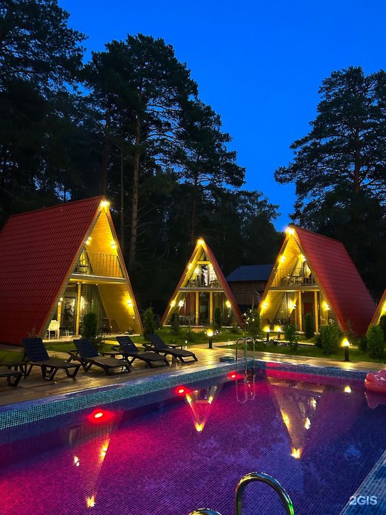 Проживание: для гостей доступны уютные А-фреймы и современные номера в модульном доме. Каждый вариант оборудован всем необходимым для комфортного отдыха. Просторная терраса с выходом к бассейну — идеальное место для утреннего кофе или завтрака с видом на природу. По вечерам территория преображается благодаря волшебной подсветке, создавая атмосферу настоящей сказки. На территории работает кафе на 30 посадочных мест, где подают вкусные и разнообразные блюда.