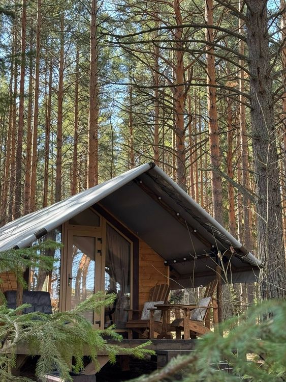 Проживание: глэпминг находится в сосновом бору на берегу озера. Эко-постройки на любой вкус: барнхаусы с сауной до 6 мест для компании, афреймы на 5 мест, более уединенные уютные сафари-тенты и модули до человек и призма-шалаш на двоих. Во всех “номерах” есть кровати, столы, стулья, розетки, Wi-Fi, мини-холодильник, микроволновка, плита для приготовления пищи, душ, туалет (кроме сафари тента и призма-шалаша - в них удобства в рядом стоящем здании).