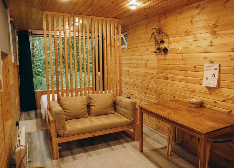 Проживание: комфортные домики, расположенные в лесу. В каждом создана особая атмосфера. Внутри: двуспальная кровать, обеденный стол, ванная, необходимые предметы быта, теплые полы, снаружи – уютная терраса с мебелью. Приоритетом глэмпинга является спокойствие и тишина.