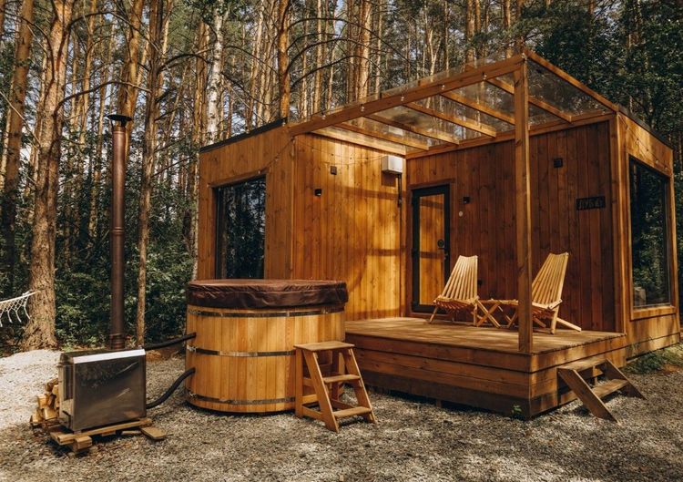 Проживание: 12 скандинавских домиков с панорамными окнами в сосновом лесу. У каждого из них имеется купель с подогревом прямо перед верандой и мангальная зона. Внутри все необходимое: двуспальные кровати, кухня со всем необходимым, душ, туалет.