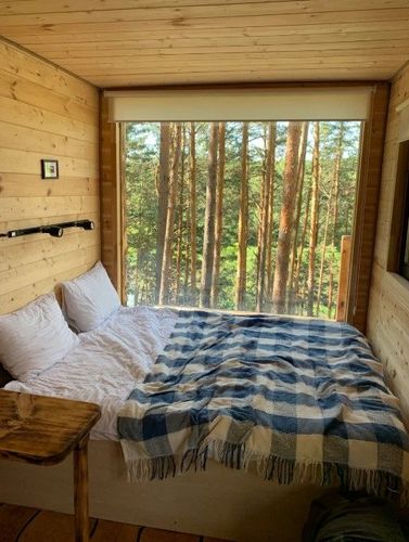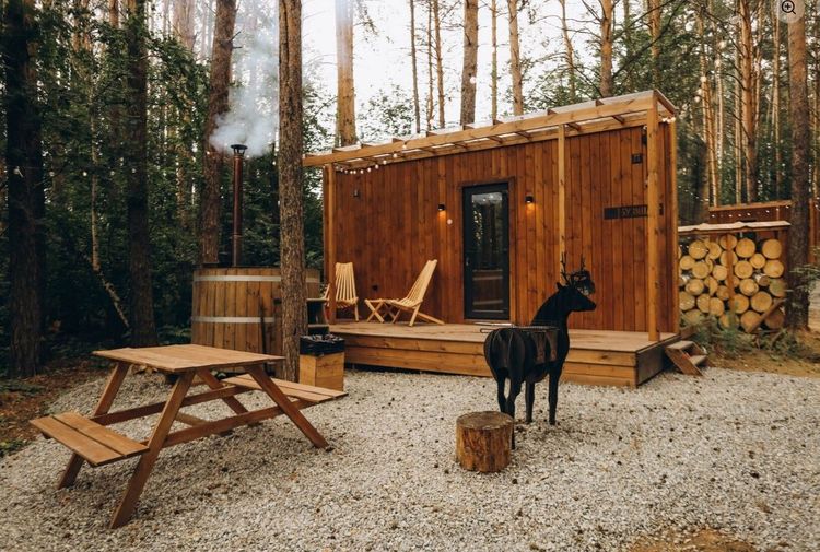Чем заняться: глэмпинг находится по-настоящему в лесной сказке - вокруг сосновый лес, рядом лазурный водоем (карьер с очень интересным цветом воды). Летом здесь можно купаться. Территория закрытая охраняемая. В хозяйственном помещении есть любимец - козлик Тарасик, его можно погладить и покормить.