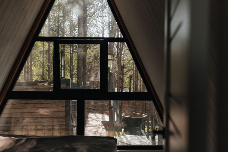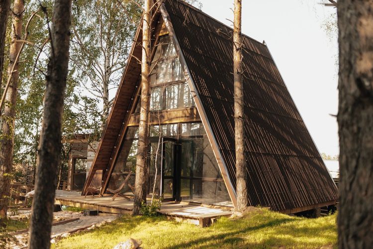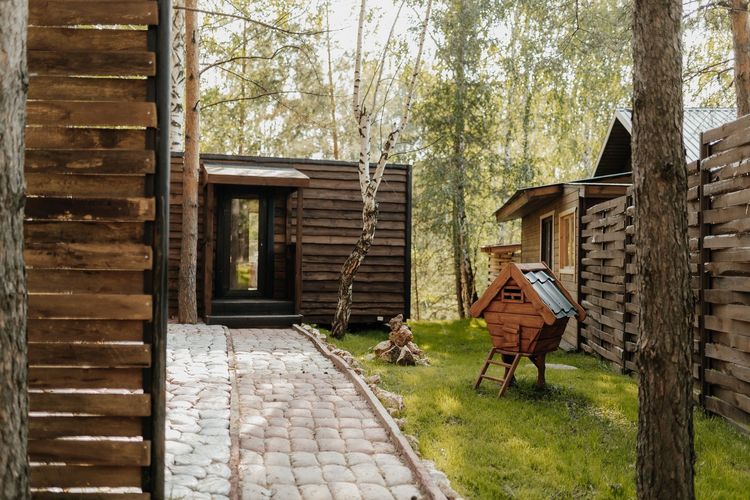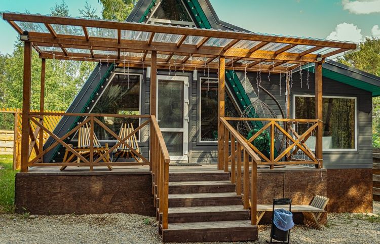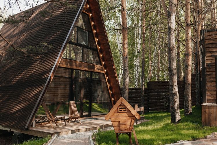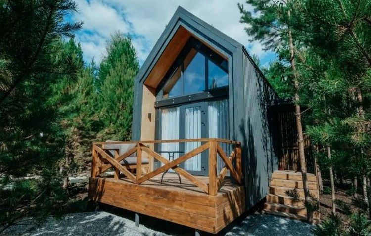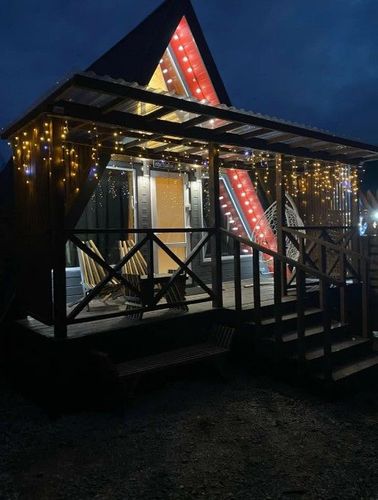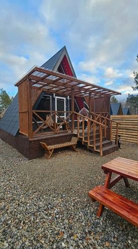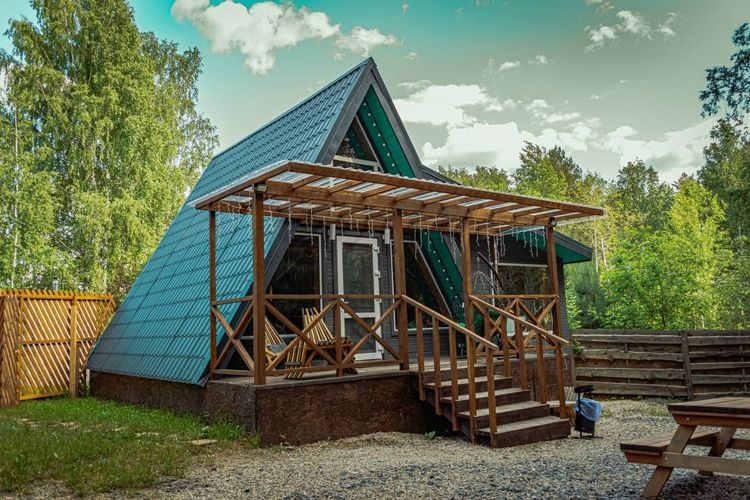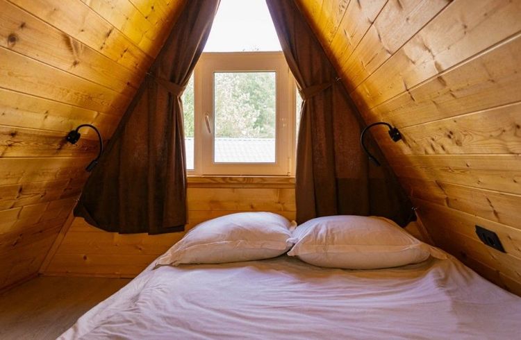 Стоимость: домики A-frame — 6 000–11 000 ₽; хижина — 5 000–7 500 ₽ в сутки.