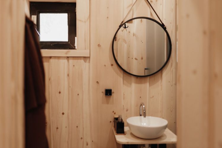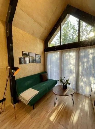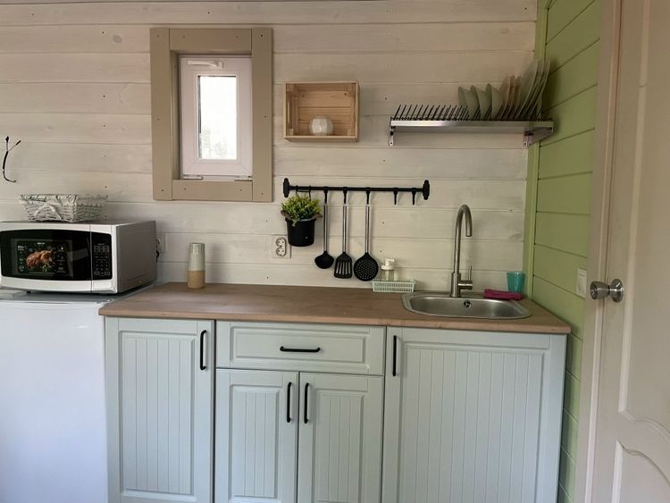 Внутри все необходимое для проживания с семьей, дружной компанией или романтического уикенда: кровати, душевая, туалет, обеденная зона с посудой и бытовой техникой. Здесь предусмотрено все на любую погоду: кондиционер, тёплый пол и конвектор.