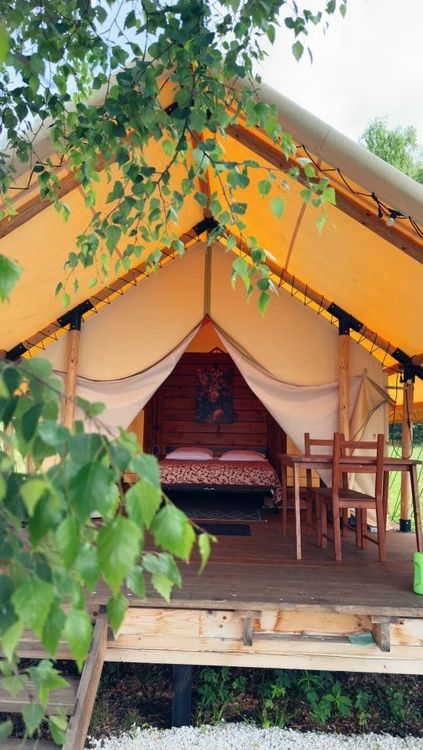 Стоимость: глэмпинг (сафари-тент) — от 5 500 ₽; баня — 1 500 ₽; купель — 4 000 ₽; аренда SUP — 600 ₽.