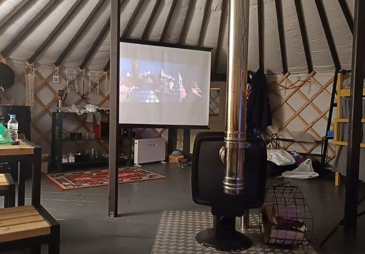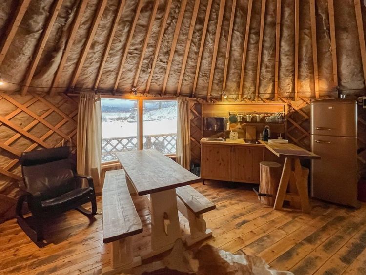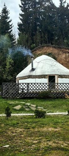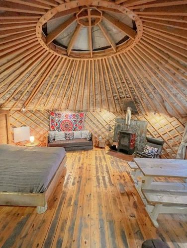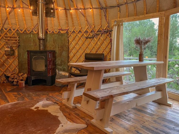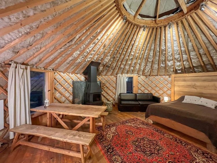 Проживание: знаете, что такое круглое здание, из деревянного каркаса утеплённое войлоком из натуральной овчины? Правильно, это юрта. В таки вот оригинальных жилищах, где даже мебель ручной работы, предлагают пожить владельцы отеля. Оригинальный дизайн юрты сочетается со всеми удобствами проживания. При том, что юрты имеют электрический обогрев, вы всегда можете воспользоваться камином с дровами. А в зоне для барбекю можно приготовить вкусный шашлык или другую вкуснятину. Так же можно арендовать и обычные деревянные домики со всеми удобствами и даже дом на дереве, если вы высоты не боитесь.