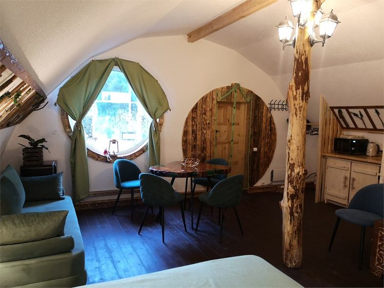 Проживание: несколько уютных домиков, оформленных в стиле фэнтези. Домик хоббита, Домик варвара, Домик феи и Домик рыцаря вмещают в себя от 4 до 6 гостей. Все домики прячутся в густой листве леса, что усиливает ощущение сказочности места. Отель должен понравиться романтикам и детям.