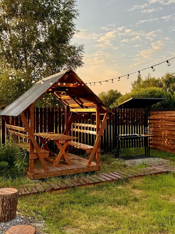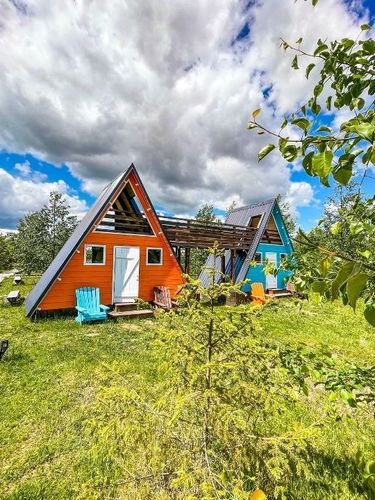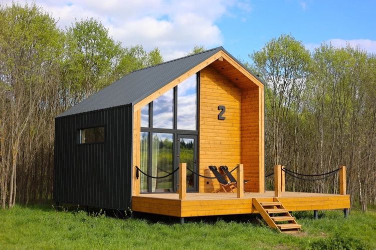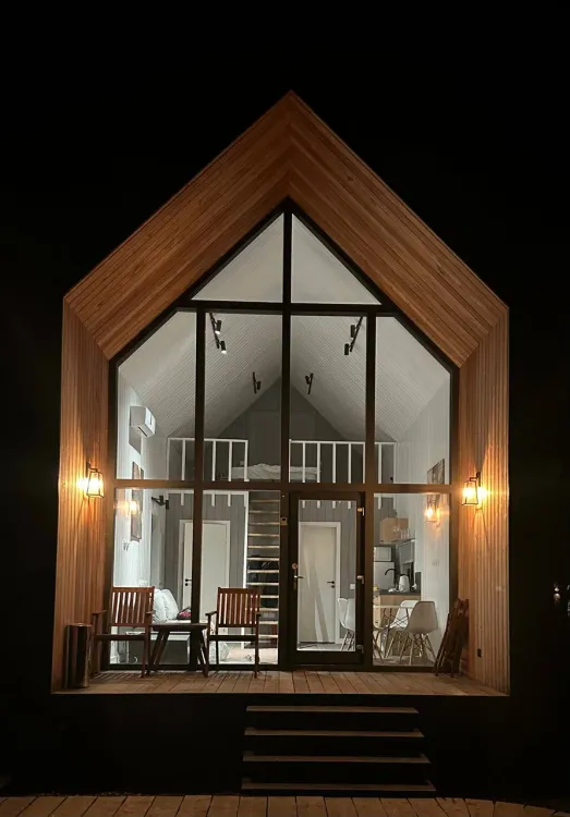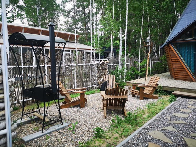 Проживание: восемь домиков со всем необходимым для приятного и спокойного времяпрепровождения , собственной мангальной зоной и камином на улице. А-фрейм домики вместимостью до 5 человек и стандартные домики вместимостью до 4 человек. На территории также имеются беседки и водоем.