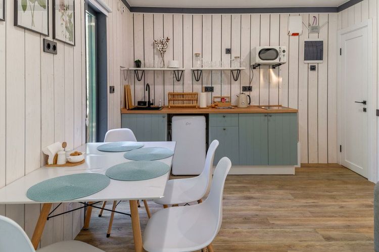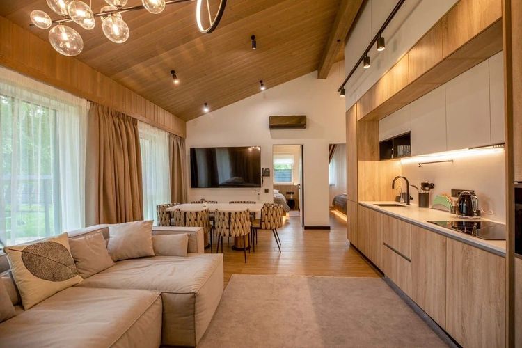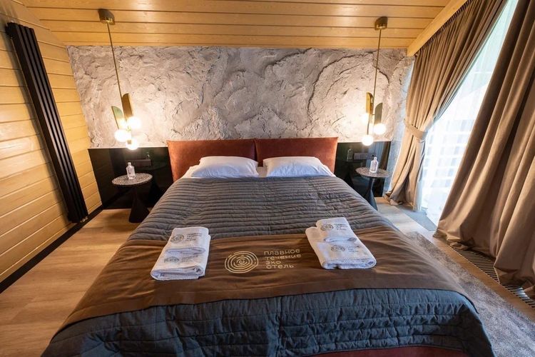 Проживание: однозначно это премиум-класс. Красиво, комфортно, приятно, но немножко дорого, однако, если хочется отдохнуть с пятизвёздным комфортом на первозданной природе, это место для вас. Шикарные коттеджи площадью 85, 130 или 150 кв.м. с великолепным дизайном сделаны только из экологически чистых материалов. В домах есть абсолютно все для приятного отдыха в комфортных условиях. Панорамные окна объединяют жилое пространство с окружающей природой создавая творческую атмосферу. Также на территории комплекса есть ресторан, где шеф-повар угостит вас своими фирменными блюдами, приготовленными только из свежих продуктов. Все, как говорится для людей, однако если у вас есть домашний питомец, придется его оставить дома или отправить в гостиницу для животных. Проживание с животными на территории запрещено.