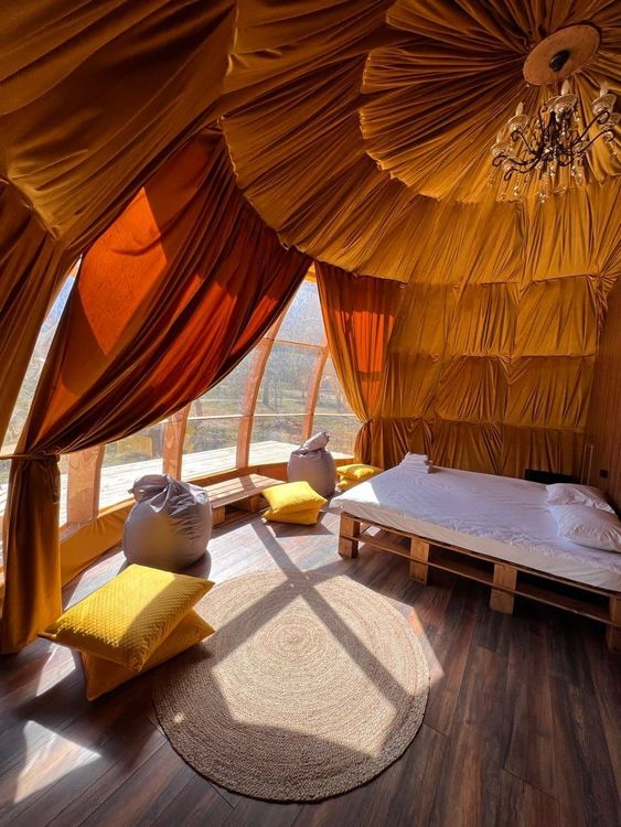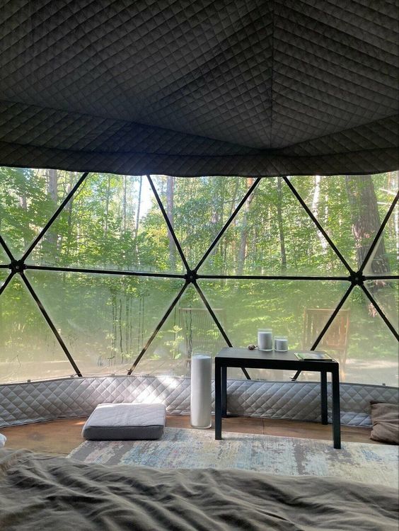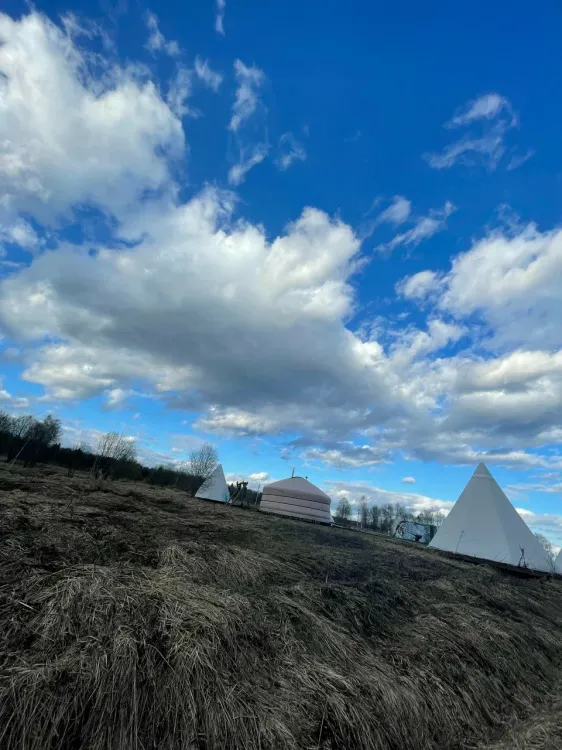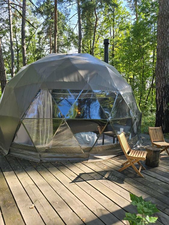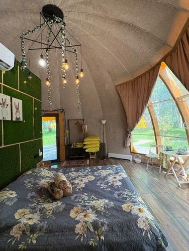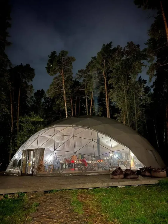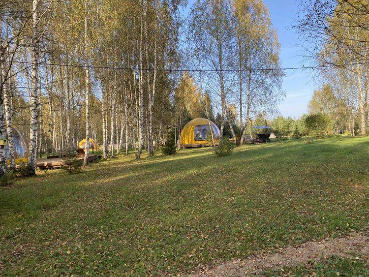 Проживание: комфортный отель из десяти куполов со всеми удобствами и нескольких домиков. Приготовить пищу можно самому, есть все необходимое. С питомцами тоже можно, даже не придется доплачивать за это отдельно. На территории есть пруд, но скорее декоративного характера, а вот в окрестностях глемпинга можно найти массу интересного.