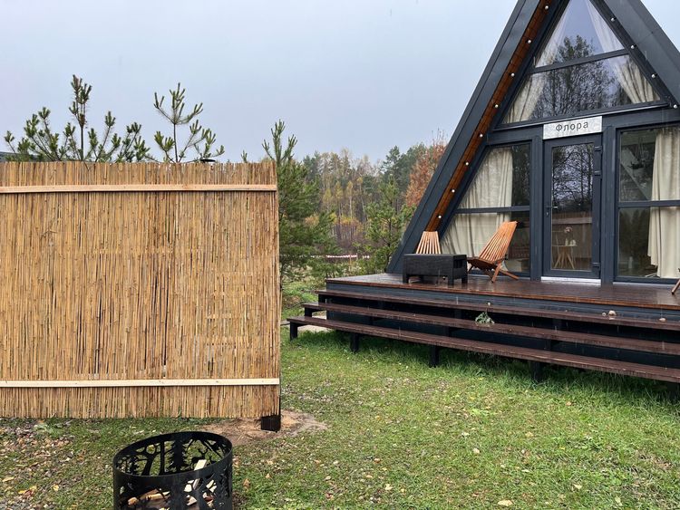 Проживание. Глэмпинг расположен недалеко от реки Руза и предлагает посетителям А-фрейм домики со всем необходимым для проживания. Есть зона для барбекю и камин. Для приготовления пищи можно заказать продукты с фермы. Вам все подберут и доставят прямо в домик. Из окон каждого А-фрейма открывается прекрасный вид на лес. Можно также привезти с собой домашнего питомца, который с радостью побегает на открытом пространстве.
