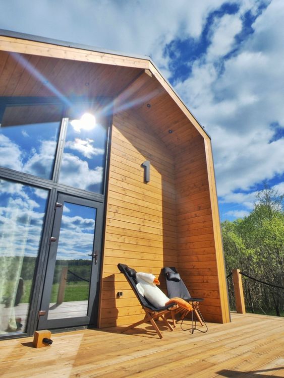 Проживание: восемь великолепных скандинавских домиков на любой вкус и запрос. Даже названия домиков вызывают желание срочно отправиться на отдых. «Куница , «Олень» , «Бобер» , «Рысь , «Ветер», «Береза, «Клен», «Пихта» вместимостью от двух до шести человек. В некоторых хижинах есть две отдельные комнаты, рядом расположены мангальные зоны, а видом из окна можно любоваться часами.